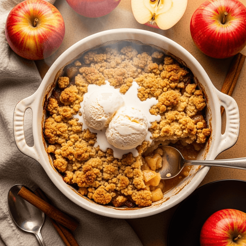 Your apple crumble is perfectly done when the topping is deep golden brown (not pale), the apple filling is bubbling enthusiastically around the edges, and a knife inserted into the center meets tender (not crunchy) apples with ease. This typically takes 40-45 minutes at 350°F. If the topping browns too quickly before apples are tender, cover loosely with foil and continue baking. Under-baked crumble has crunchy apples and runny juice; properly baked has tender fruit and thickened, syrupy juices.