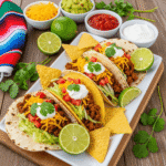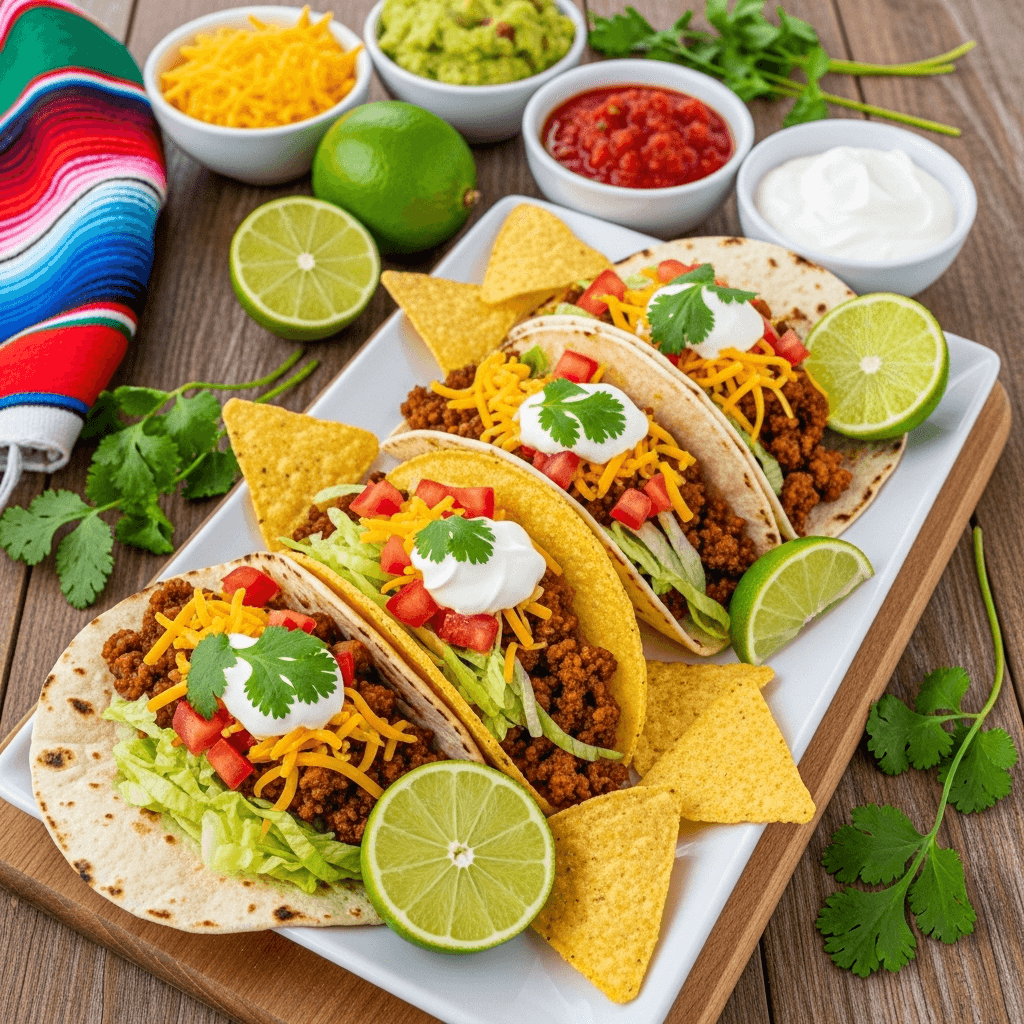Complete Meal Ideas: For a full taco feast, start with tortilla chips, salsa, and guacamole as appetizers. Serve tacos with Mexican rice and refried beans on the side. Finish with churros, sopapillas, or tres leches cake for dessert.
