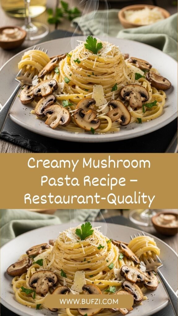 Divide the creamy mushroom pasta among serving plates or bowls. Garnish with extra Parmesan cheese, fresh herbs, and freshly cracked black pepper. Serve immediately while hot and creamy. The pasta is best enjoyed fresh, though leftovers are also delicious.