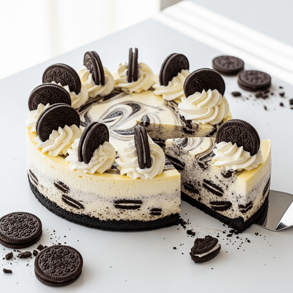 For impressive party presentation, place the whole cheesecake on a cake stand and surround the base with fresh berries or Oreo cookies. Dust the top with powdered sugar or cocoa powder just before serving. For kids’ parties, add colorful sprinkles and mini Oreos on top.