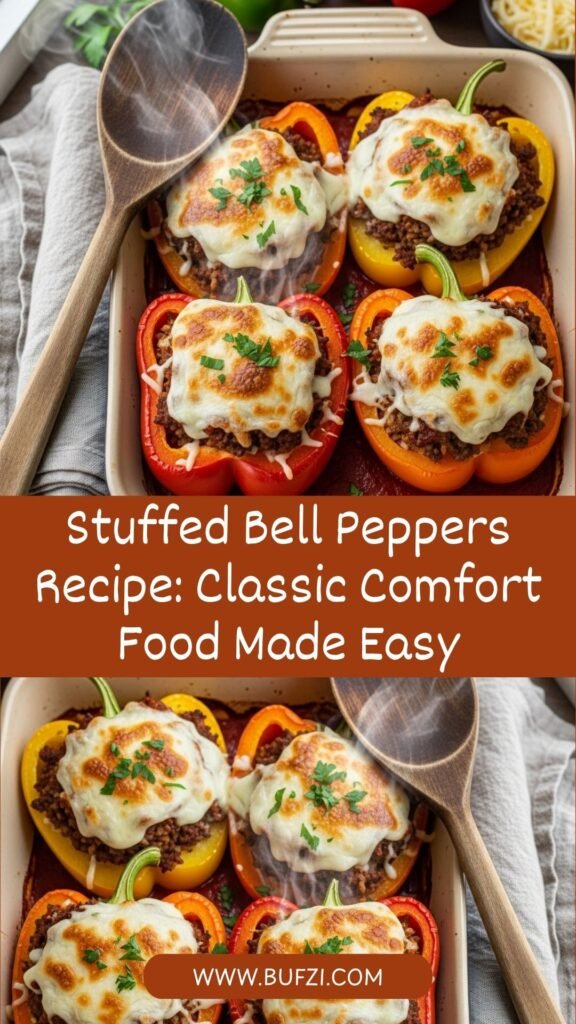 Stuffed bell peppers are one of those timeless comfort food classics that never go out of style. This hearty, wholesome dish features colorful bell peppers filled with a savory mixture of seasoned ground beef, tender rice, aromatic vegetables, and melted cheese—all baked to perfection. It’s a complete meal in one beautiful package that’s as nutritious as it is delicious.